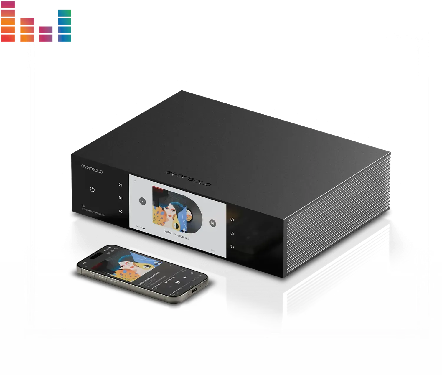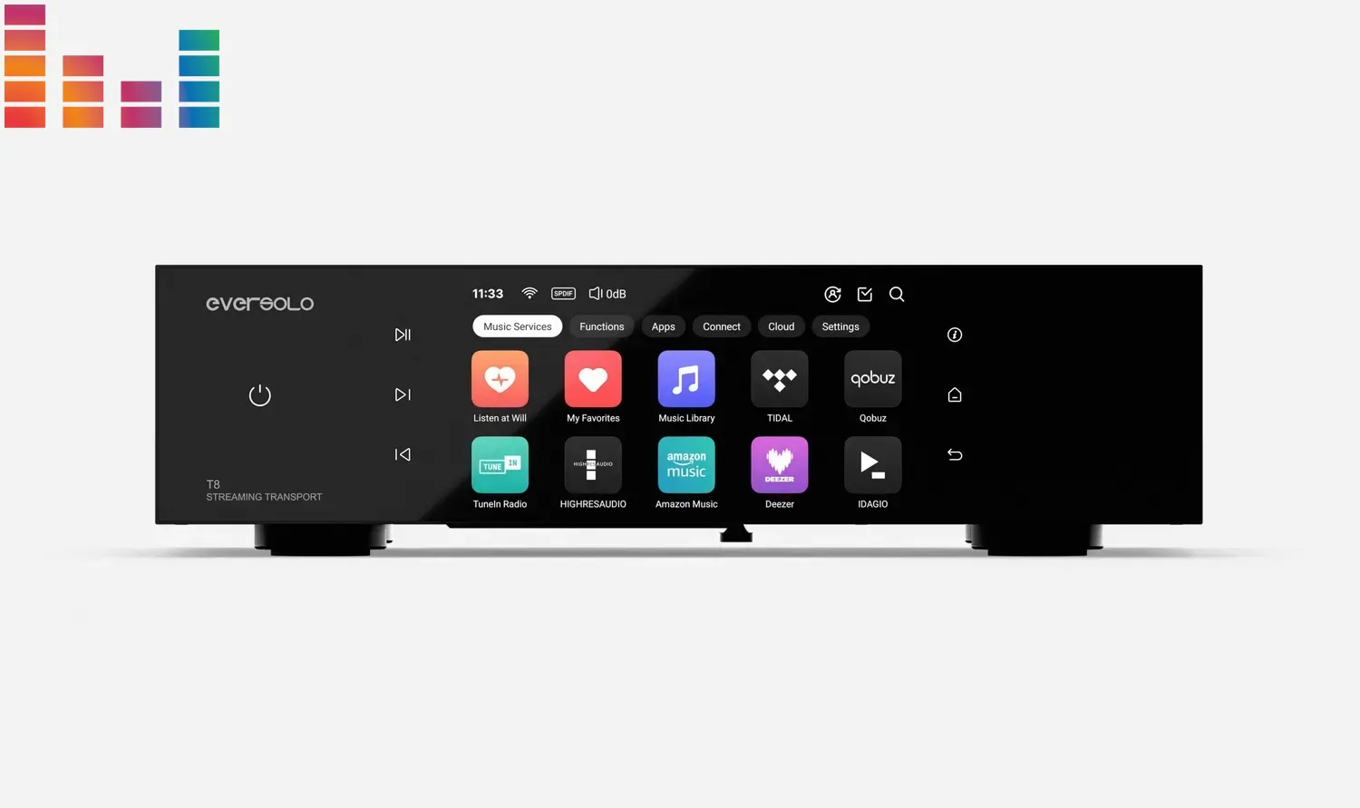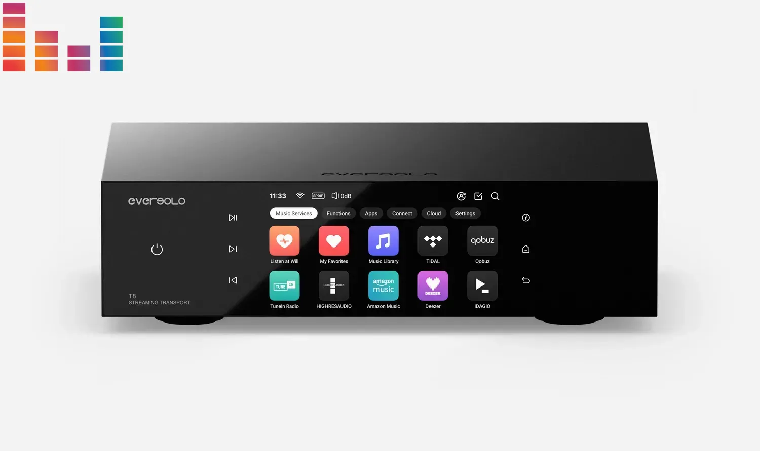 Eversolo T8 — це мережевий аудіотранспорт преміум-класу, створений для аудіофілів та професіоналів. Він забезпечує надточну передачу цифрового сигналу завдяки фемтосекундному генератору та безшумному лінійному живленню. Пристрій підтримує відтворення високої роздільної здатності до 768 кГц / 32 біт, має сучасний сенсорний дисплей та широкий набір інтерфейсів для інтеграції у будь-яку Hi-Fi систему.
